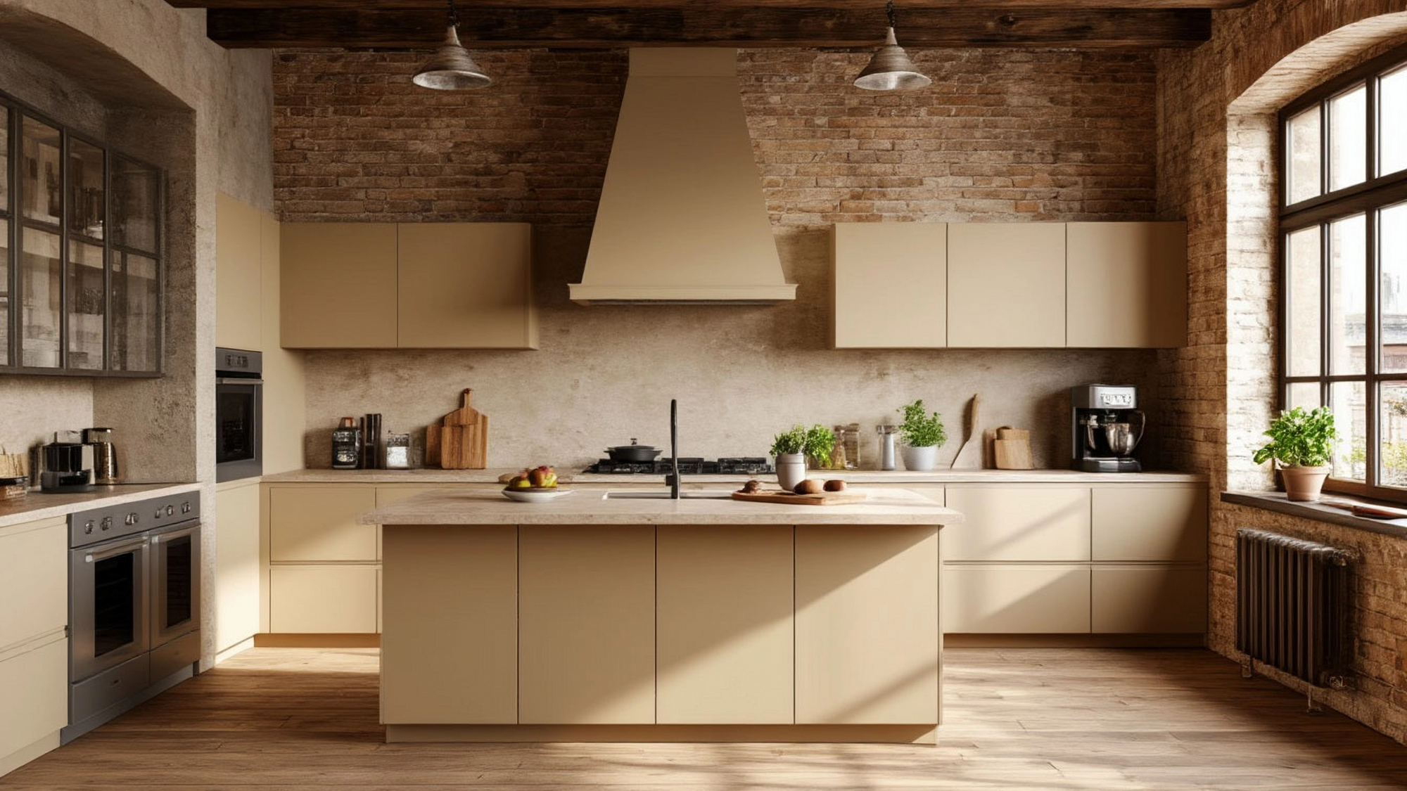 Дизайн кухни "Дакота" гармонично сочетает индустриальные элементы и естественные текстуры. Бежевый цвет фасадов, дерево и металл создают выразительный контраст, который придает интерьеру глубину и динамику. Светлая столешница визуально расширяет пространство, а металлические акценты подчёркивают строгость линий и современный характер кухни. Такое сочетание позволяет создавать комфортную атмосферу, где уют и стиль сосуществуют с максимальной функциональностью.