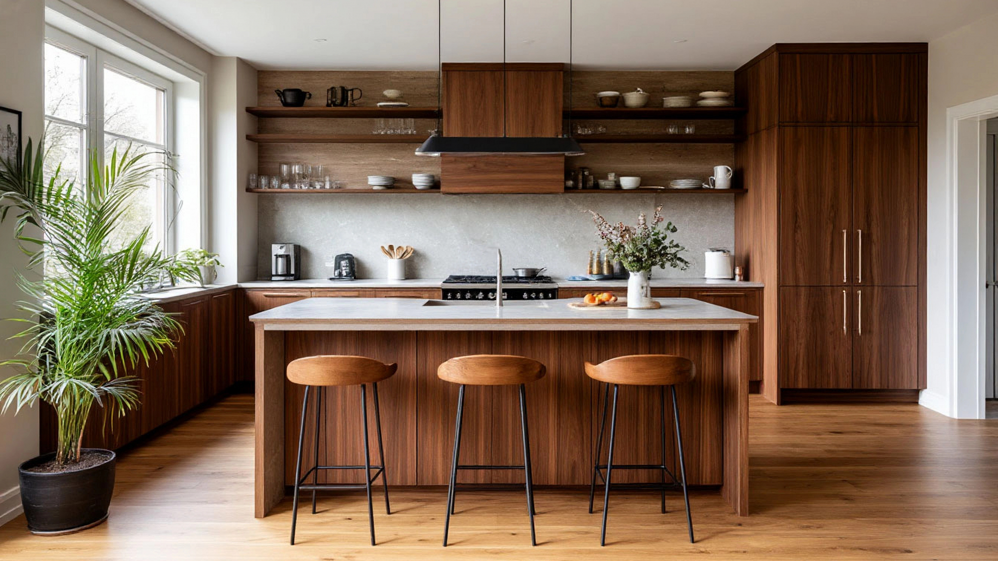 Дерево ореха — материал особый. Он не просто тёплый на вид, он имеет характер. Его прожилки напоминают линии ветра, его оттенки переходят от светлого меда к мягкому шоколаду, его поверхность хранит тепло человеческих рук. В кухне "Элинор" этот материал раскрывается особенно тонко: гладкие фасады, естественный рисунок волокон, едва заметный матовый блеск. Такое дерево не требует украшений — оно само является украшением.