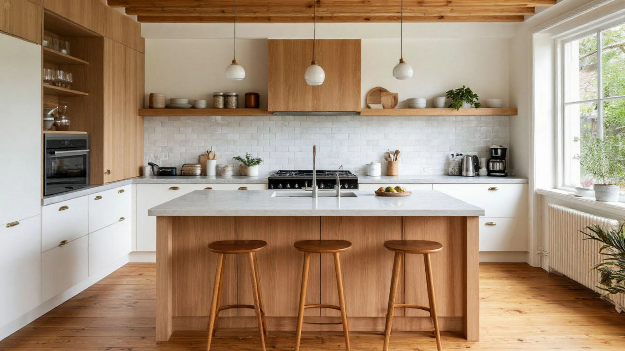 Буфет, полки и остров выполняют не только функциональную, но и декоративную роль, делая интерьер завершённым и гармоничным. Светлые поверхности фасадов визуально увеличивают пространство, а деревянные элементы добавляют тепла и домашнего уюта. Остров является центром кухни, объединяя зоны приготовления пищи, хранения и отдыха. Такая организация пространства позволяет легко готовить, организовывать семейные трапезы и принимать гостей, создавая атмосферу уюта и комфорта.