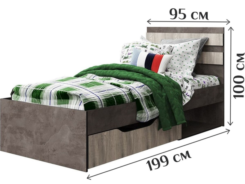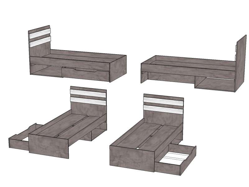 Особенности модели: Головной щит и детали кровати, которые в эксплуатации подвержены механическим повреждениям, облицованы кромкой ПВХ толщиной 2 мм. Спальное место 1950*900 мм. Основание щитовое, в основании установлен ящик выкатной для постельного белья. Ящик может устанавливаться как справа, так и слева кровати.