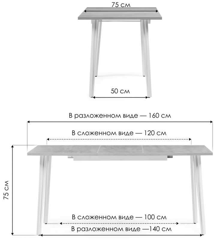 Стол деревянный Денвер Лофт 120(160)х75х75 25 мм бетон / черный матовый (75x75).