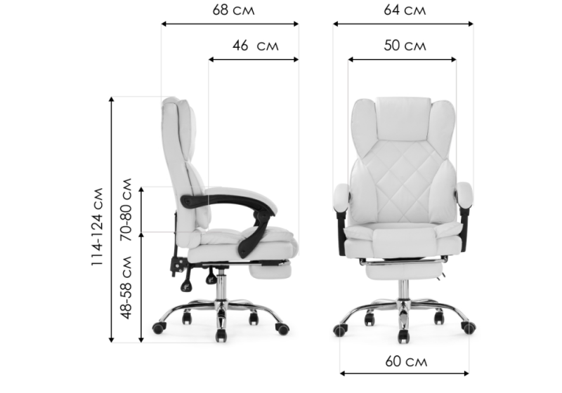 Высота подлокотников: 70 - 80 см. Диаметр крестовины: 60 см.